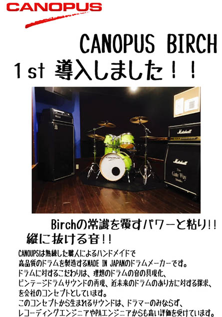 CANOPUS BIRCH 導入 Posted 6月 24, 20165月 31, 2017 gateway-admin 1スタジオのドラムセットがCANOPUS BIRCHセットになりました!数々のトップドラマーを虜にした魅惑なサウンド・・・是非、お試しください!